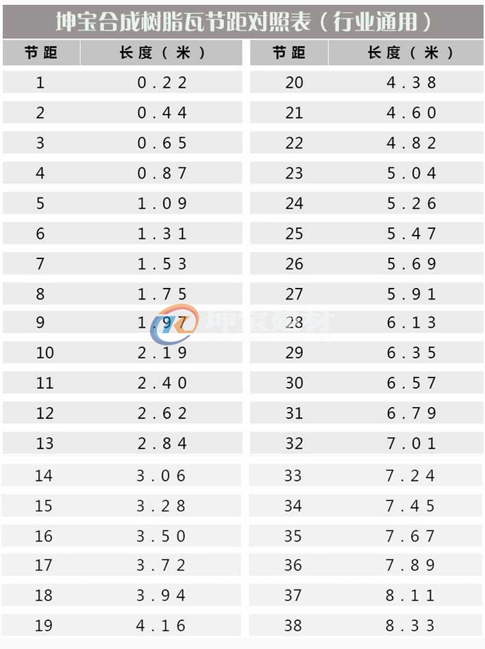 下面是坤寶樹(shù)脂瓦節(jié)距表,行業(yè)里面都是通用的哦。