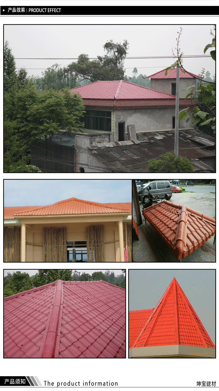 本公司經營的合成樹脂瓦、秸稈瓦等產品品種豐富、顏色多樣,可滿足不同客戶的需求,《坤寶牌》合成樹脂瓦具有輕質,防水,堅韌,保溫隔熱,隔音,抗腐蝕,抗風抗震, 抗污,綠色環(huán)保,防火,絕緣,超長壽命,安裝簡便等優(yōu)點,它突出的特點是色彩豐富并長久不褪色,造型美觀立體感強且符合我國建筑文化特色。同時,它還是各類永久建筑屋面裝飾和防火的理想材料,尤其適用于我國目前大力推廣的“城市形象工程改造”和“新農村屋面工程”。