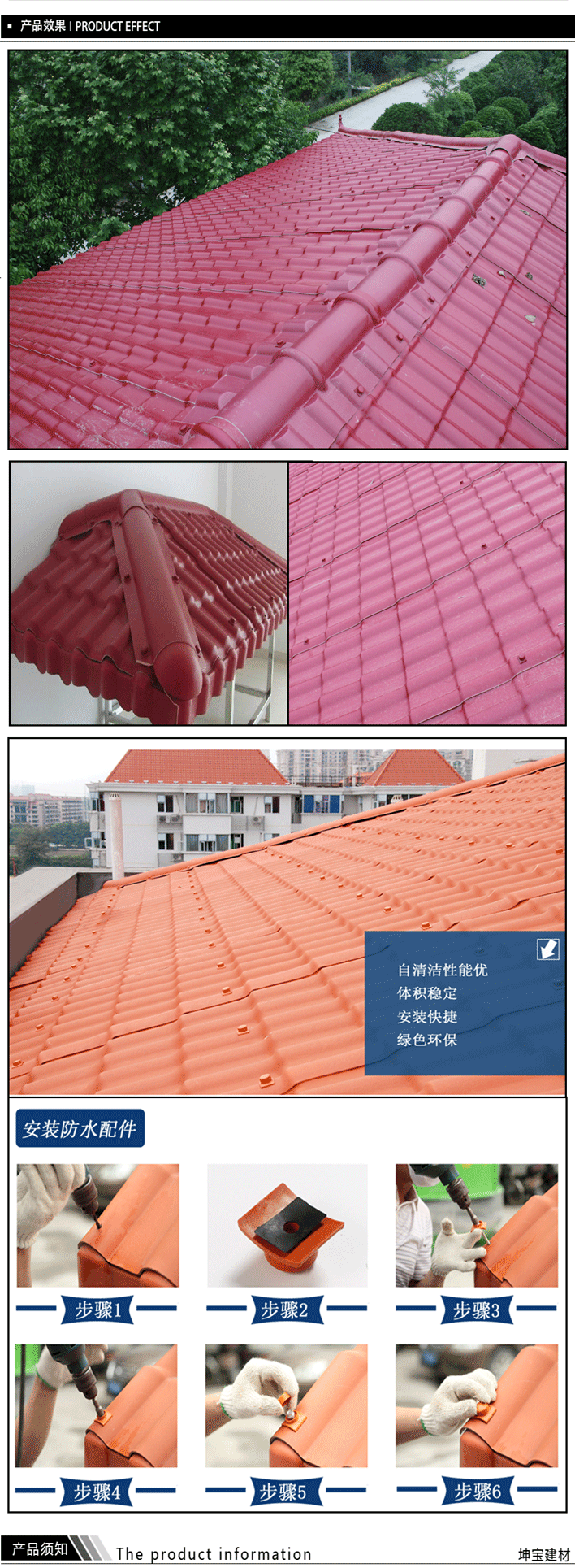 本公司經(jīng)營的合成樹脂瓦、秸稈瓦等產(chǎn)品品種豐富、顏色多樣,可滿足不同客戶的需求,《坤寶牌》合成樹脂瓦具有輕質(zhì),防水,堅(jiān)韌,保溫隔熱,隔音,抗腐蝕,抗風(fēng)抗震, 抗污,綠色環(huán)保,防火,絕緣,超長壽命,安裝簡便等優(yōu)點(diǎn),它突出的特點(diǎn)是色彩豐富并長久不褪色,造型美觀立體感強(qiáng)且符合我國建筑文化特色。同時(shí),它還是各類永久建筑屋面裝飾和防火的理想材料,尤其適用于我國目前大力推廣的“城市形象工程改造”和“新農(nóng)村屋面工程”。