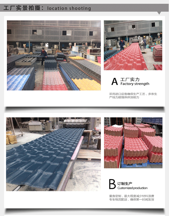 由于樹脂瓦的厚度和顏色不同,在定做的時候需要重新配置原料和顏色,所需定做時間根據(jù)數(shù)量大小一般大概在1-3天便可出貨。