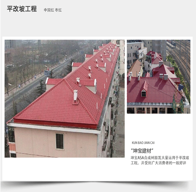 成都坤寶建筑材料有限公司,是一家專業(yè)經(jīng)營新型綠色環(huán)保節(jié)能的建材公司。坤寶建材從成立之初跟隨國家倡導的綠色環(huán)保節(jié)能方針同步,我們的產(chǎn)品覆蓋建筑外墻裝飾應用、建筑屋面等領域。主營產(chǎn)品包括ASA合成樹脂瓦、秸稈纖維超強聚酯瓦、秸稈纖維掛壁板、PVC塑鋼瓦、APVC復合瓦、柔性飾面磚、軟瓷、保溫材料等產(chǎn)品。我們以優(yōu)異的產(chǎn)品質(zhì)量獲得了廣大客戶的信賴,坤寶環(huán)保屋面瓦及其他綠色新型建材特點具有:環(huán)保節(jié)能、隔熱阻燃、防水、防腐蝕、抗紫外線、柔性好,不易脆裂,隔音抗載荷性能強!使用壽命長等特性,在行業(yè)內(nèi)遠遠領先其他廠家生產(chǎn)的環(huán)保材料。